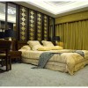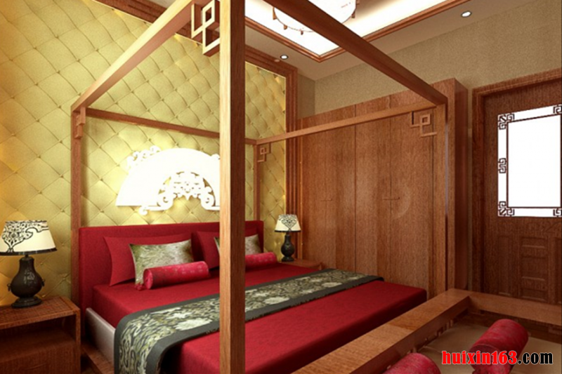 卧室吊顶可以设计黑色木结构框架,顶梁起伏造型设计,适当雕花修饰,较深的颜色,给人尊贵而古雅、深沉稳重之感。实木复合地板铺地,清晰的纹理,自然的颜色,让人感觉既浪漫又艺术。电视背景墙的设计比较简单,可以带给人们一种舒适感。