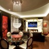 本套餐厅装饰中空间内的色彩搭配主要是以白色为主,石膏板吊顶的造型则可以带给人们一种时尚感,也将中间的黑色铁艺吊灯衬托的更加具有个性,下方的实木餐桌上搭配了一款色彩素雅的桌布,更是为空间增添了一丝温馨之意。