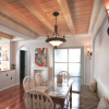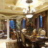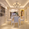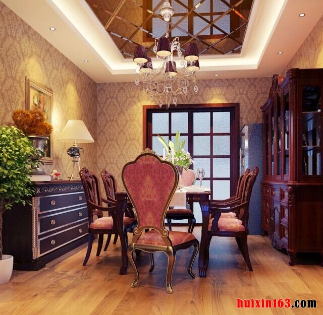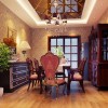 本套餐厅装饰中石膏板吊顶的造型设计十分具有特色,一款带有棱形图案的镜面装饰镶嵌在石膏板中间,十分具有设计感,中间一盏水晶吊灯的搭配更使吊灯显得华美,搭配上下方的实木餐桌,使整个空间都充满了典雅的气息。