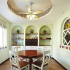 美式风格的餐厅装饰中空间内的色彩搭配往往都是比较素雅的,并不会有华丽的装饰,但整体的装饰也并不缺乏设计感,并不会带给人们枯燥的感觉,在带给人们一种新鲜感的同时,美式风格也在彰显独特的魅力。 本套餐厅装饰中石膏板吊顶的造型设计十分具有特色,一款带有棱形图案的镜面装饰镶嵌在石膏板中间,十分具有设计感,中间一盏水晶吊灯的搭配更使吊灯显得华美,搭配上下方的实木餐桌,使整个空间都充满了典雅的气息。 更多»推荐家装效果图