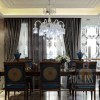 本套餐厅装饰中石膏板吊顶的造型设计十分具有特色,一款带有棱形图案的镜面装饰镶嵌在石膏板中间,十分具有设计感,中间一盏水晶吊灯的搭配更使吊灯显得华美,搭配上下方的实木餐桌,使整个空间都充满了典雅的气息。