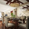 本套餐厅装饰中空间内的色彩搭配可以带给人们一种舒适感,浅色调的空间可以带给人们一种温馨感,石膏板吊顶的造型设计更是可以使整个空间都具有一定的时尚气息,餐桌上方一款黑色铁艺吊灯在浅色调的空间内显得更加时尚并具有设计感。