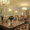 本套餐厅装饰中空间内的色彩搭配可以带给人们一种舒适感,浅色调的空间可以带给人们一种温馨感,石膏板吊顶的造型设计更是可以使整个空间都具有一定的时尚气息,餐桌上方一款黑色铁艺吊灯在浅色调的空间内显得更加时尚并具有设计感。
