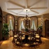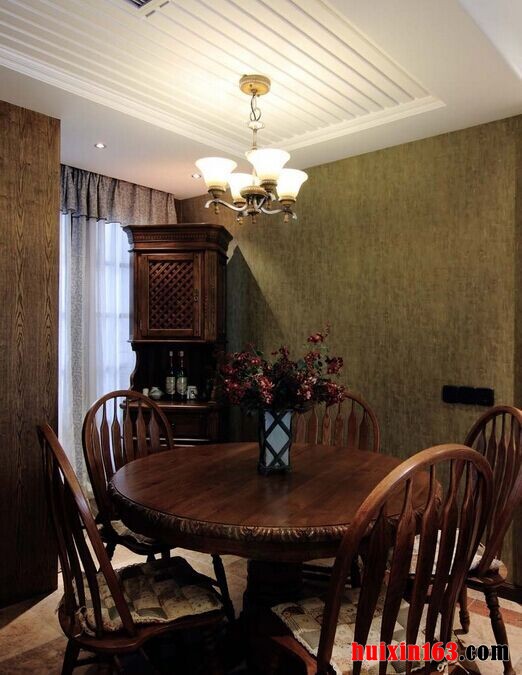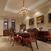 美式风格的装饰可以带给人们一种粗犷的感觉,空间内的整体装饰会带给人们一种大气感,但仔细观察空间内部的设计又会发现一丝精美与时尚感,同时整个空间的装饰也会带给我们一种舒适性和自在感。 本套餐厅装饰中石膏板吊顶的造型设计十分具有个性,空间内的墙壁以暗绿色为主,将白色的吊灯映衬的更加富有设计感,同时也带有一丝华美的气息,一款实木餐桌摆放在中间,在吊灯的照射下显得更加具有古典气息。 更多»推荐家装效果图