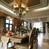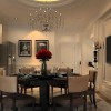 本套餐厅装饰中石膏板吊顶的造型设计十分具有个性,空间内的墙壁以暗绿色为主,将白色的吊灯映衬的更加富有设计感,同时也带有一丝华美的气息,一款实木餐桌摆放在中间,在吊灯的照射下显得更加具有古典气息。