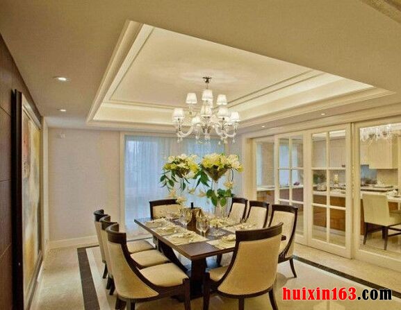 本套餐厅装饰中石膏板吊顶的造型设计十分具有个性,空间内的墙壁以暗绿色为主,将白色的吊灯映衬的更加富有设计感,同时也带有一丝华美的气息,一款实木餐桌摆放在中间,在吊灯的照射下显得更加具有古典气息。