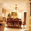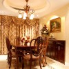 本套餐厅装饰中石膏板吊顶的设计比较简洁,但也可以从中感受到一丝大气感,中间一盏铁艺灯饰在吊灯的衬托下显得十分别致,更是将下方的实木餐桌衬托的更加高档。