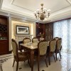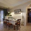 本套餐厅装饰中石膏板吊顶的设计比较简洁,但也可以从中感受到一丝大气感,中间一盏铁艺灯饰在吊灯的衬托下显得十分别致,更是将下方的实木餐桌衬托的更加高档。