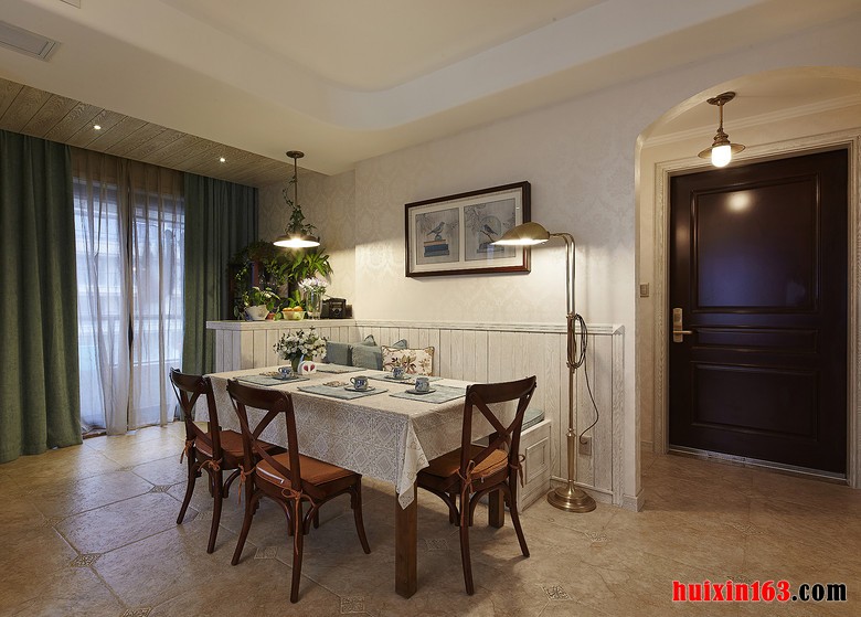 美式风格的空间装饰可以带给我们一种大气感,但空间内部的设计却是十分精致的,空间内偶尔的彩色做点缀更是可以为设计增添一份美感,如果想突出个性设计,那也可以在空间随意搭配上富有个性的装饰物品。 本套餐厅装饰中石膏板吊顶的设计比较简洁,但也可以从中感受到一丝大气感,中间一盏铁艺灯饰在吊灯的衬托下显得十分别致,更是将下方的实木餐桌衬托的更加高档。 更多»推荐家装效果图