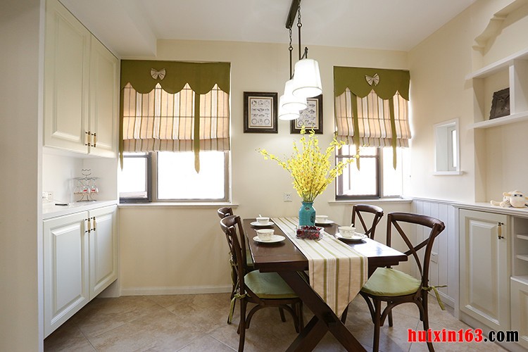 美式风格的餐厅装饰往往都会带给人们一种清新感,空间内的装饰并不会十分繁杂,只是简单的造型设计在搭配上柔和的色彩,便可以使整个空间都显得十分具有自然气息,从而带给人们一种亲切的舒适感。