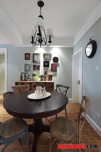 美式风格的餐厅装饰往往都会带给人们一种清新感,空间内的装饰并不会十分繁杂,只是简单的造型设计在搭配上柔和的色彩,便可以使整个空间都显得十分具有自然气息,从而带给人们一种亲切的舒适感。