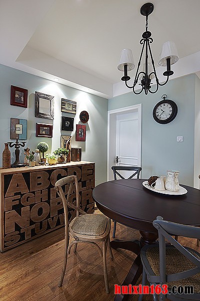 美式风格的餐厅装饰往往都会带给人们一种清新感,空间内的装饰并不会十分繁杂,只是简单的造型设计在搭配上柔和的色彩,便可以使整个空间都显得十分具有自然气息,从而带给人们一种亲切的舒适感。