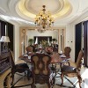 本套餐厅装饰中石膏板吊顶的设计比较简洁,圆形的圈边设计看似简单,却使整个空间都显得十分具有层次感,圆形的造型设计与下方的实木餐桌相对,更能够凸显出一种呼应的美感,圆形的设计也富有“团团圆圆”的美好寓意。