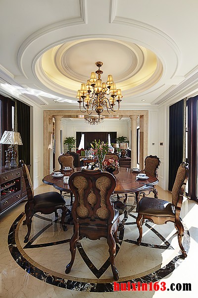 本套餐厅装饰中石膏板吊顶的设计比较简洁,圆形的圈边设计看似简单,却使整个空间都显得十分具有层次感,圆形的造型设计与下方的实木餐桌相对,更能够凸显出一种呼应的美感,圆形的设计也富有“团团圆圆”的美好寓意。