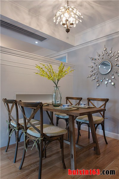 美式风格的餐厅装饰往往都会带给人们一种清新感,空间内的装饰并不会十分繁杂,只是简单的造型设计在搭配上柔和的色彩,便可以使整个空间都显得十分具有自然气息,从而带给人们一种亲切的舒适感。