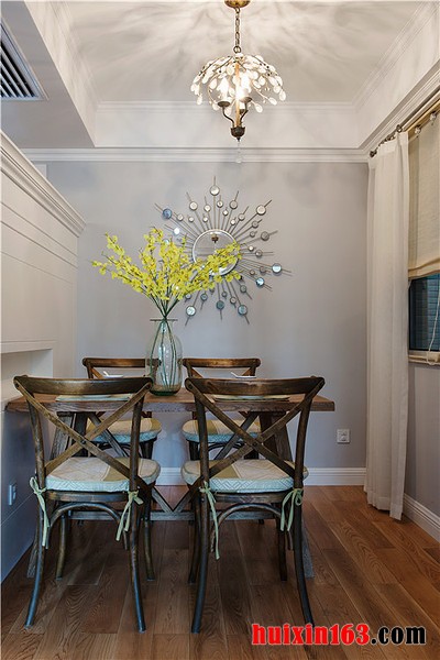 美式风格的餐厅装饰往往都会带给人们一种清新感,空间内的装饰并不会十分繁杂,只是简单的造型设计在搭配上柔和的色彩,便可以使整个空间都显得十分具有自然气息,从而带给人们一种亲切的舒适感。