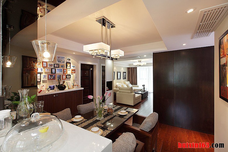 本套餐厅装饰中空间内的石膏板吊顶比较吸引人,平顶式的设计并不会显得枯燥,反而是可以将中间的黑色吊灯凸显的更加别致,黑色的框架在白色吊顶的衬托下显得更急富有设计感,同时黑白色的搭配也使空间多了一丝时尚气息。