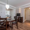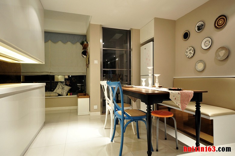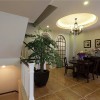 本套餐厅装饰中空间内的石膏板吊顶比较吸引人,平顶式的设计并不会显得枯燥,反而是可以将中间的黑色吊灯凸显的更加别致,黑色的框架在白色吊顶的衬托下显得更急富有设计感,同时黑白色的搭配也使空间多了一丝时尚气息。