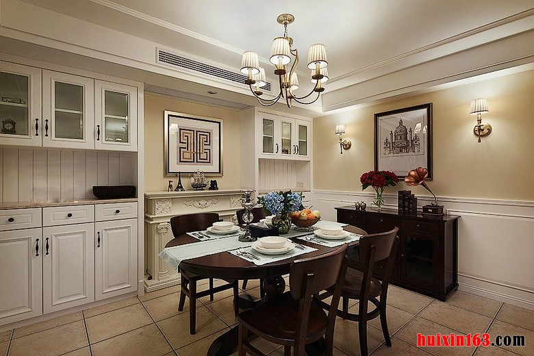 现代美式风格的居室装修所要表达的多半是轻松与舒适,自然朴实的装饰似乎更能带给人们亲切感,都市生活中的压力与枯燥在回到家中的一刹那便全部溶解,带给我们更多的则是舒适与休闲。 本套餐厅装饰中石膏板吊顶的造型比较具有设计感,一款十分具有质感的金属吊灯悬挂在餐桌上方,为空间装饰增添了些许设计感,同时也展示出了业主不凡的欣赏水品与时尚品味。 更多»推荐家装效果图