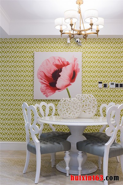 本套餐厅装饰中石膏板吊顶的造型比较具有设计感,一款十分具有质感的金属吊灯悬挂在餐桌上方,为空间装饰增添了些许设计感,同时也展示出了业主不凡的欣赏水品与时尚品味。