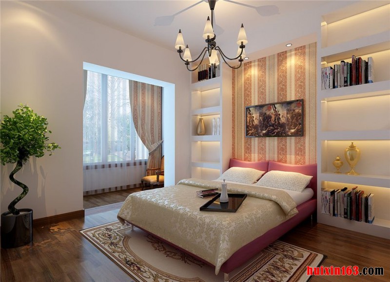 卧室凹凸有致古典吊顶,体现出一种大气,为房间增添了几分庄严。一盏吊灯悬挂在天花板上,增添了几分美观。显示出一种个性。古典的家具,给人很好的立体感,为房间添姿,彰显了一份成熟与稳重。空间层次感十足,端正稳健、精致华美。居室在色彩方面秉承了传统古典风格的典雅和华贵,但与之不同的是加入了很多现代元素,呈现着时尚的特征。