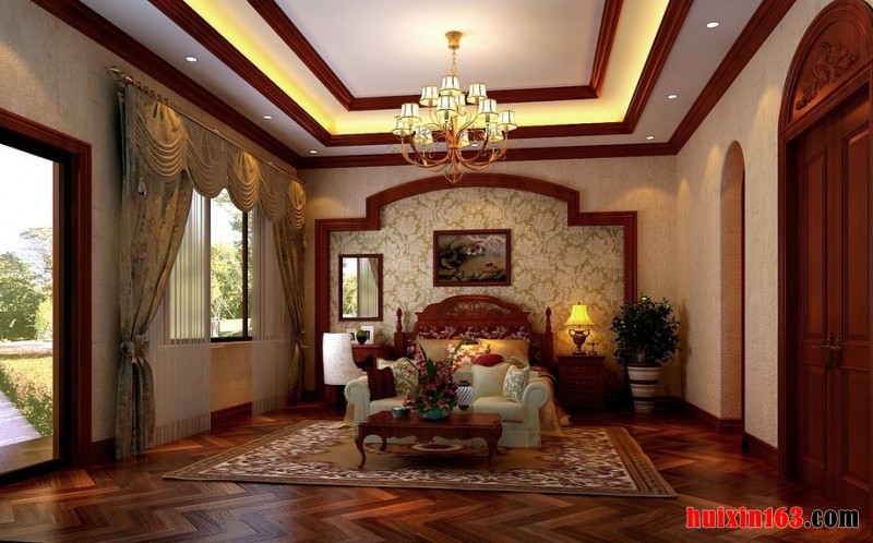 卧室凹凸有致古典吊顶,体现出一种大气,为房间增添了几分庄严。一盏吊灯悬挂在天花板上,增添了几分美观。显示出一种个性。古典的家具,给人很好的立体感,为房间添姿,彰显了一份成熟与稳重。空间层次感十足,端正稳健、精致华美。居室在色彩方面秉承了传统古典风格的典雅和华贵,但与之不同的是加入了很多现代元素,呈现着时尚的特征。