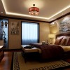 走进卧室,首先的看到的棕色的床,床上的四件套整齐的摆放着,透出古典的感觉。整体设计豪华大气,端庄时尚。棕色的吊顶悬挂着三盏喇叭花样式的吊灯,浪漫的气氛自然流露,给人特别舒服的状态。整体营造出儒雅端庄、隽秀典雅的古典风格家居。