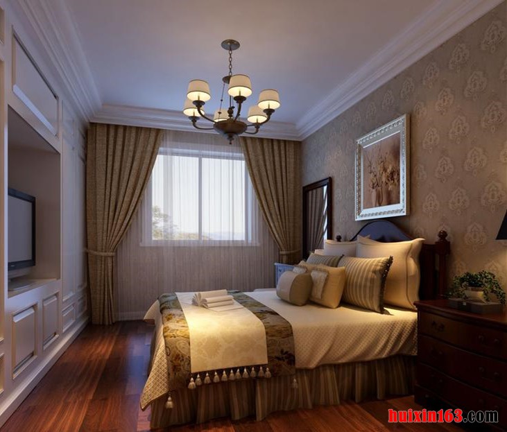 走进卧室,首先的看到的棕色的床,床上的四件套整齐的摆放着,透出古典的感觉。整体设计豪华大气,端庄时尚。棕色的吊顶悬挂着三盏喇叭花样式的吊灯,浪漫的气氛自然流露,给人特别舒服的状态。整体营造出儒雅端庄、隽秀典雅的古典风格家居。