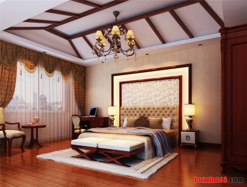卧室吊顶采用格子吊顶设计,格子形状吊顶不仅看上去古典而且可以无聊时昂头的时候可以看到整个卧室的装潢,卧室里的实木的家具,十分有质感。整个空间高雅且独特。卧室的装饰十分温馨。对于其中的经典元素以及环境的描写,琳琅满目,精致的家具摆放,仅仅从字里行间就透露出一种古典而华贵的气质,一张亮丽的水晶吊灯安装,色泽不一的抱枕添加,将空间的色彩演绎得比较绚丽。