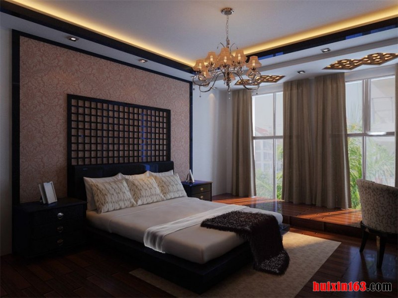 卧室吊顶采用格子吊顶设计,格子形状吊顶不仅看上去古典而且可以无聊时昂头的时候可以看到整个卧室的装潢,卧室里的实木的家具,十分有质感。整个空间高雅且独特。卧室的装饰十分温馨。对于其中的经典元素以及环境的描写,琳琅满目,精致的家具摆放,仅仅从字里行间就透露出一种古典而华贵的气质,一张亮丽的水晶吊灯安装,色泽不一的抱枕添加,将空间的色彩演绎得比较绚丽。