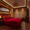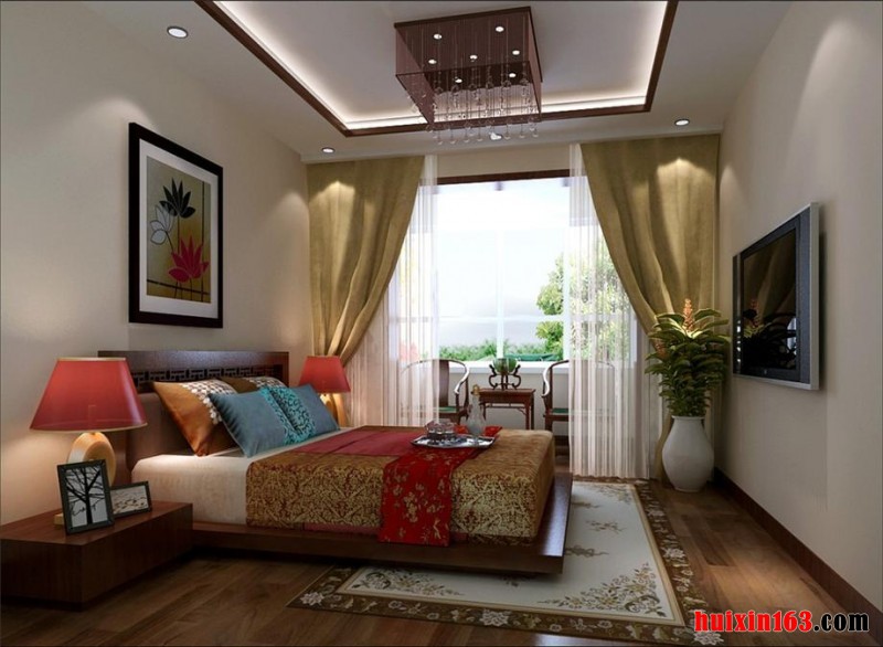 卧室吊顶采用格子吊顶设计,格子形状吊顶不仅看上去古典而且可以无聊时昂头的时候可以看到整个卧室的装潢,卧室里的实木的家具,十分有质感。整个空间高雅且独特。卧室的装饰十分温馨。对于其中的经典元素以及环境的描写,琳琅满目,精致的家具摆放,仅仅从字里行间就透露出一种古典而华贵的气质,一张亮丽的水晶吊灯安装,色泽不一的抱枕添加,将空间的色彩演绎得比较绚丽。