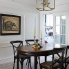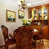 本套餐厅装饰的整体效果可以带给人们一种舒适感,空间内石膏板吊顶的设计比较简约,平顶式的造型中间搭配了一款铁艺灯饰,灯光打在实木餐桌上可以使原本单调的餐厅显得十分富有古典气息。