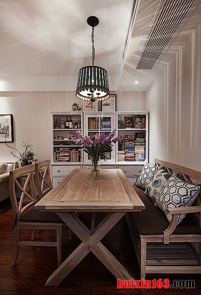本套餐厅装饰的主色彩是以浅色调为主,原木材质的餐桌造型别致,却掩盖不住其材质所散发出的自然气息,石膏板吊顶的造型设计十分具有个性,中间一盏设计感十足的吊灯更是可以彰显出时尚的气息。