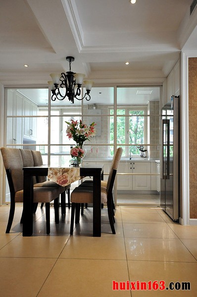 本套餐厅装饰中石膏板吊顶的造型设计比较简洁,但并不会带给人们单调的感觉,而是将中间的吊灯衬托的更加别致,实木餐桌上搭配了素雅的桌旗,可以将瓷质餐具衬托的更加精美。
