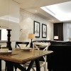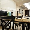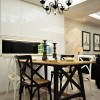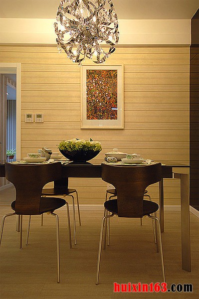 本套餐厅装饰中石膏板吊顶的造型设计比较简洁,但并不会带给人们单调的感觉,而是将中间的吊灯衬托的更加别致,实木餐桌上搭配了素雅的桌旗,可以将瓷质餐具衬托的更加精美。
