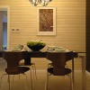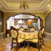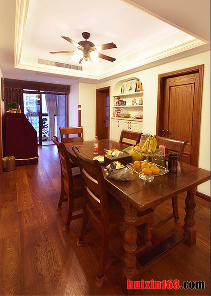 本套餐厅装饰中石膏板吊顶的造型设计比较简洁,但并不会带给人们单调的感觉,而是将中间的吊灯衬托的更加别致,实木餐桌上搭配了素雅的桌旗,可以将瓷质餐具衬托的更加精美。