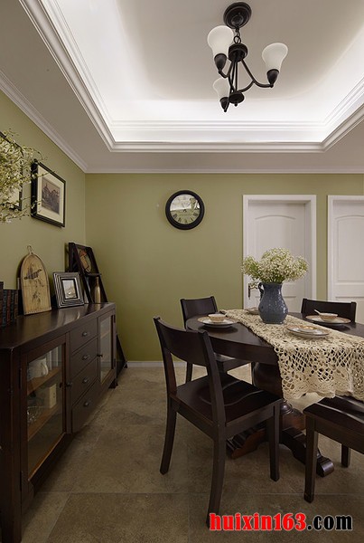 美式风格的装饰一般会以简约为主,空间内的整体设计并不会有过于夸张,装饰的色彩也会比较素雅,整体的装饰效果可以带给人们一种自然的清新感,整体的装饰也会带给人们一种舒适的体验,这也是近年来美式风格越来越受追捧的原因之一。 本套餐厅装饰中石膏板吊顶的造型设计比较简洁,但并不会带给人们单调的感觉,而是将中间的吊灯衬托的更加别致,实木餐桌上搭配了素雅的桌旗,可以将瓷质餐具衬托的更加精美。 更多»推荐家装效果图