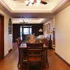 本套餐厅装饰中石膏板吊顶的造型设计比较简洁,但并不会带给人们单调的感觉,而是将中间的吊灯衬托的更加别致,实木餐桌上搭配了素雅的桌旗,可以将瓷质餐具衬托的更加精美。