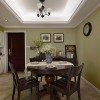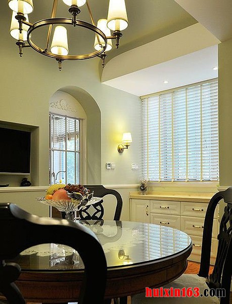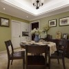 本套餐厅装饰中石膏板吊顶的造型设计比较简洁,但并不会带给人们单调的感觉,而是将中间的吊灯衬托的更加别致,实木餐桌上搭配了素雅的桌旗,可以将瓷质餐具衬托的更加精美。