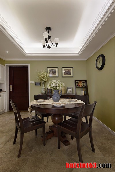 本套餐厅装饰中石膏板吊顶的造型设计比较简洁,但并不会带给人们单调的感觉,而是将中间的吊灯衬托的更加别致,实木餐桌上搭配了素雅的桌旗,可以将瓷质餐具衬托的更加精美。
