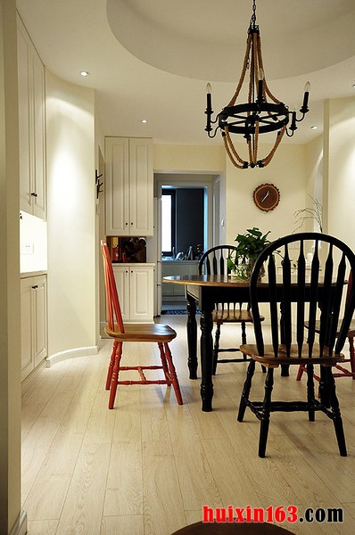 本套餐厅装饰中石膏板吊顶的造型设计比较简洁,但并不会带给人们单调的感觉,而是将中间的吊灯衬托的更加别致,实木餐桌上搭配了素雅的桌旗,可以将瓷质餐具衬托的更加精美。