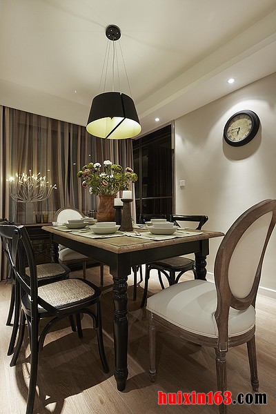 本套餐厅内的装饰整体效果可以带给人们一种大气感,空间内的装饰都比较简洁,没有夸张的造型设计,也没有艳丽的色彩搭配,素雅的空间内却也并不缺乏美感,餐桌上的格子桌旗更是可以彰显出房屋主人的品味。