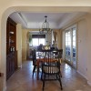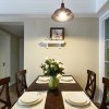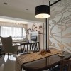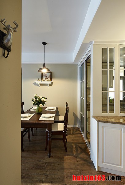 本套餐厅装饰的整体效果可以带给人们一种唯美的视觉效果,空间内的石膏板吊顶采用了平顶式的设计,并在中间悬挂了一盏造型别致的吊灯,十分具有设计感,原木材质的餐桌也因此显得更加独特。