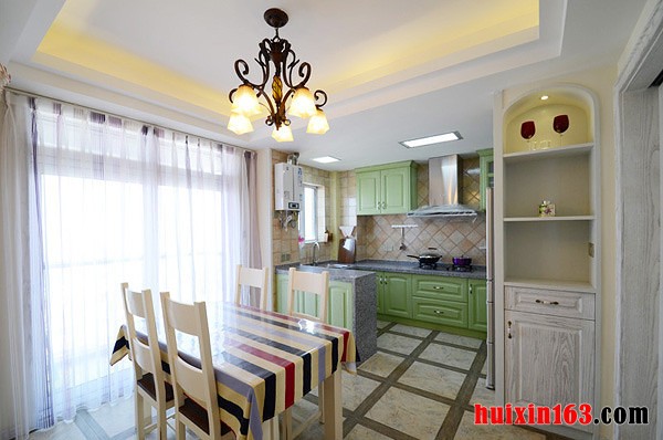 本套餐厅装饰的整体效果可以带给人们一种唯美的视觉效果,空间内的石膏板吊顶采用了平顶式的设计,并在中间悬挂了一盏造型别致的吊灯,十分具有设计感,原木材质的餐桌也因此显得更加独特。