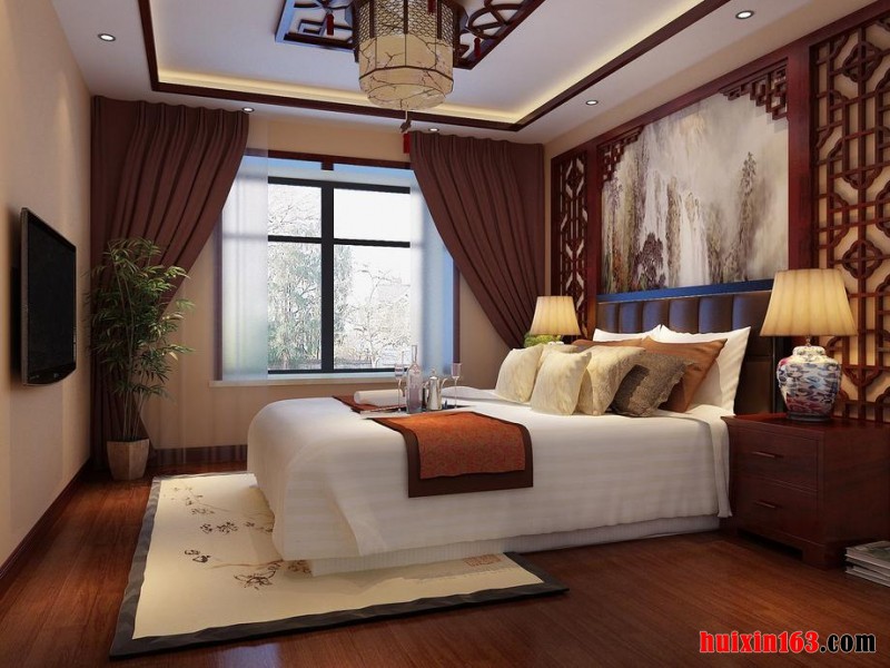 古典的卧室有的不只是传统的沉稳大气,更多的是轻松和淡雅。本案的硬装设计中没有做过多的繁杂造型,卧室吊顶采用了古典的镂空雕花设计,配上中国红镂空吊灯,使得这个给卧室充满了精致的感觉。而卧室整体家具与周围环境的结合就呈现出新中式的设计独特魅力。给人带来无穷无尽的舒适感。