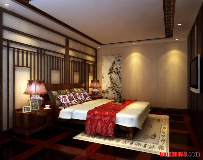 古典的卧室有的不只是传统的沉稳大气,更多的是轻松和淡雅。本案的硬装设计中没有做过多的繁杂造型,卧室吊顶采用了古典的镂空雕花设计,配上中国红镂空吊灯,使得这个给卧室充满了精致的感觉。而卧室整体家具与周围环境的结合就呈现出新中式的设计独特魅力。给人带来无穷无尽的舒适感。