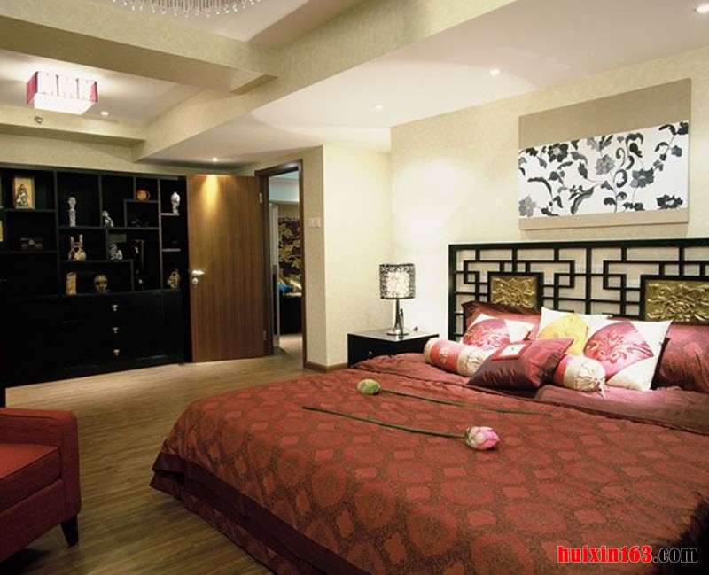 古典的卧室有的不只是传统的沉稳大气,更多的是轻松和淡雅。本案的硬装设计中没有做过多的繁杂造型,卧室吊顶采用了古典的镂空雕花设计,配上中国红镂空吊灯,使得这个给卧室充满了精致的感觉。而卧室整体家具与周围环境的结合就呈现出新中式的设计独特魅力。给人带来无穷无尽的舒适感。