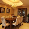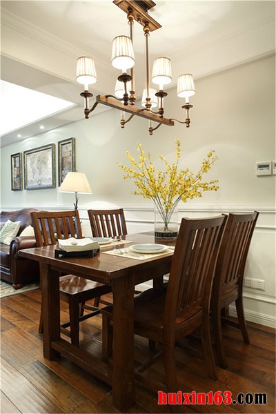美式风格的居室设计中一般都不会添加过多的造型设计,而是靠软装饰来凸显风格特点,空间内的划分主要是通过削弱或强化梁柱来再造框架,也会通过色彩搭配来凸显装饰的亮点。 本套餐厅的设计比较具有个性,空间内的石膏板到顶采用了平顶式的设计,中间悬挂了一盏黑色铁艺灯饰,别致的造型十分具有设计感,下方的实木餐桌的设计比较简洁,但与空间内的所有装饰搭配在一起也会多了几分时尚感。 更多»推荐家装效果图