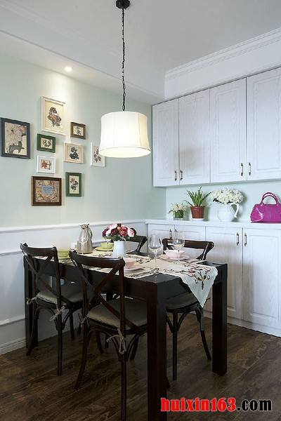 本套餐厅装饰中空间内的色彩搭配主要是以白色为主,石膏板吊顶的设计也比较简洁,原本单调的设计在搭配上吊灯后显得十分别致,也将吊灯的衬托的更加别致并附有时尚感。