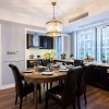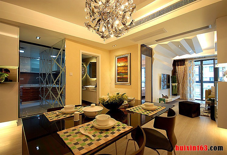 本套餐厅装饰中空间内的色彩搭配主要是以白色为主,石膏板吊顶的设计也比较简洁,原本单调的设计在搭配上吊灯后显得十分别致,也将吊灯的衬托的更加别致并附有时尚感。